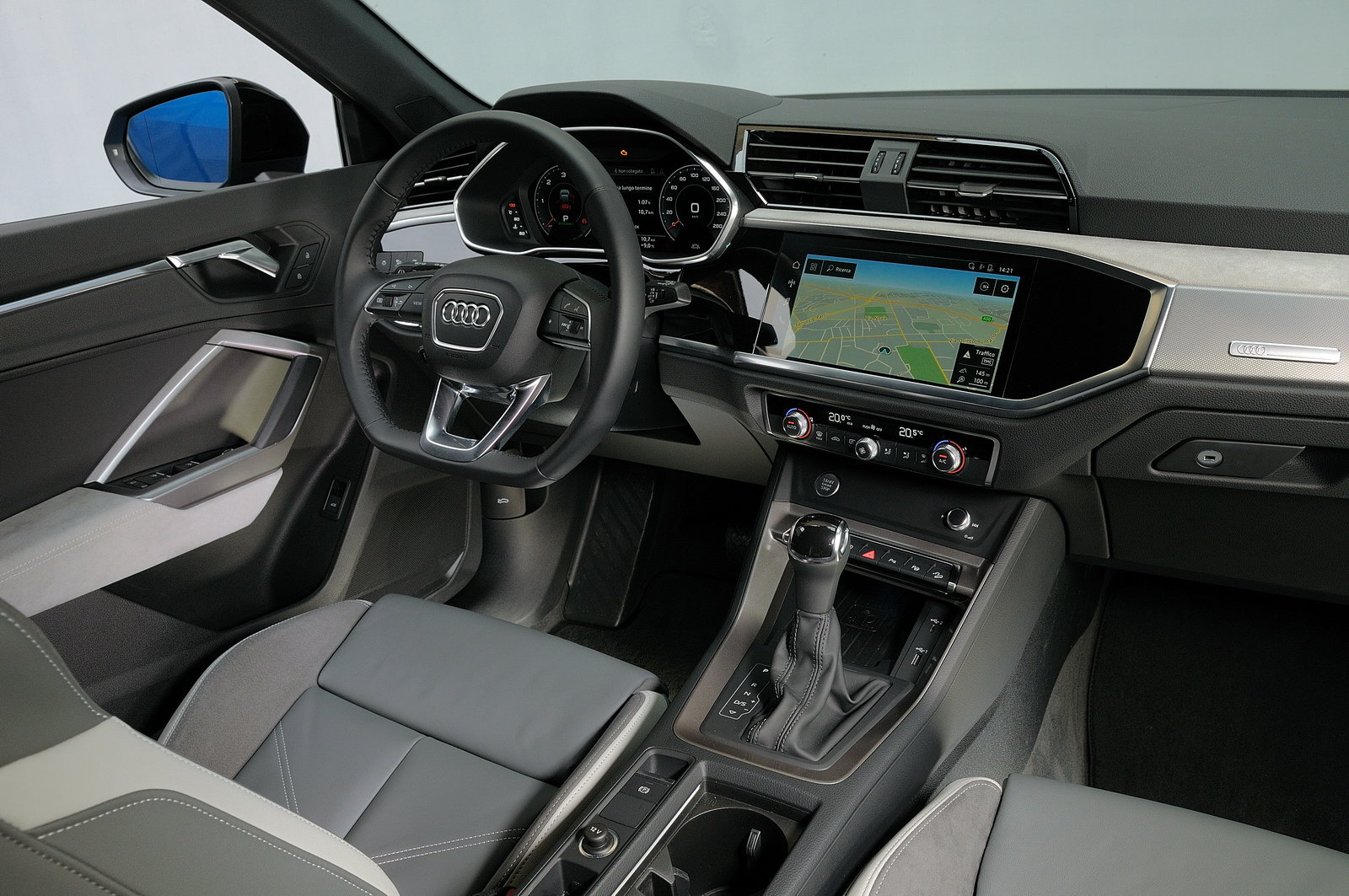A bordo della Q3 Sportback si respira l’atmosfera di un’auto di categoria superiore. Gli interni sono curati nei minimi dettagli, con materiali soft-touch, luci ambientali e una plancia pulita e tecnologica. Il Virtual Cockpit da 10,25” è di serie e permette di personalizzare le informazioni di guida, mentre il display centrale touch MMI da 10,1” offre una connettività completa (Apple CarPlay, Android Auto, navigatore, assistente vocale).